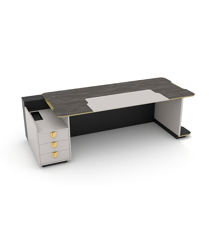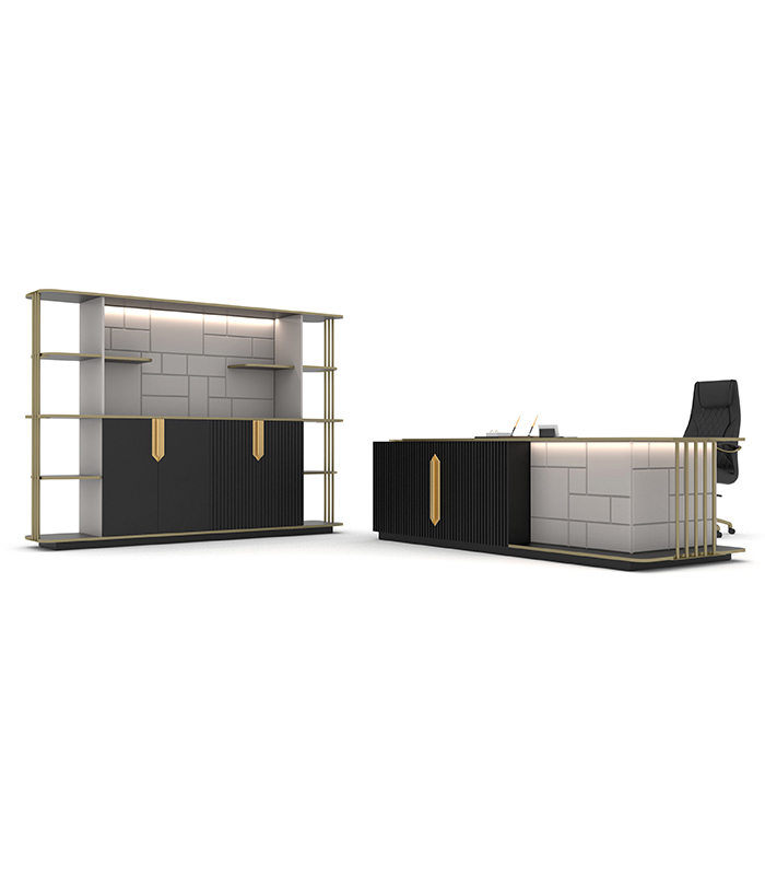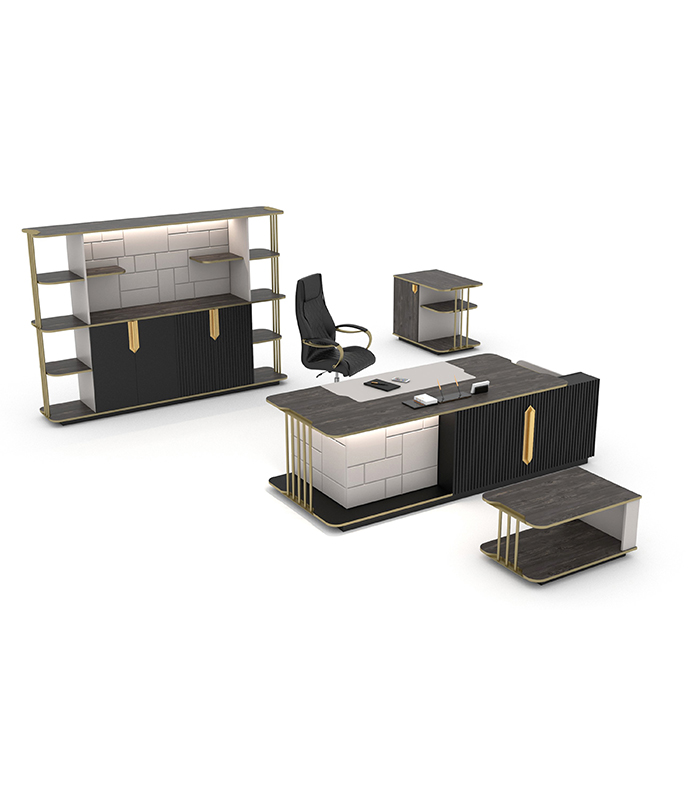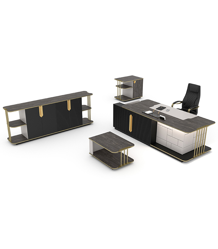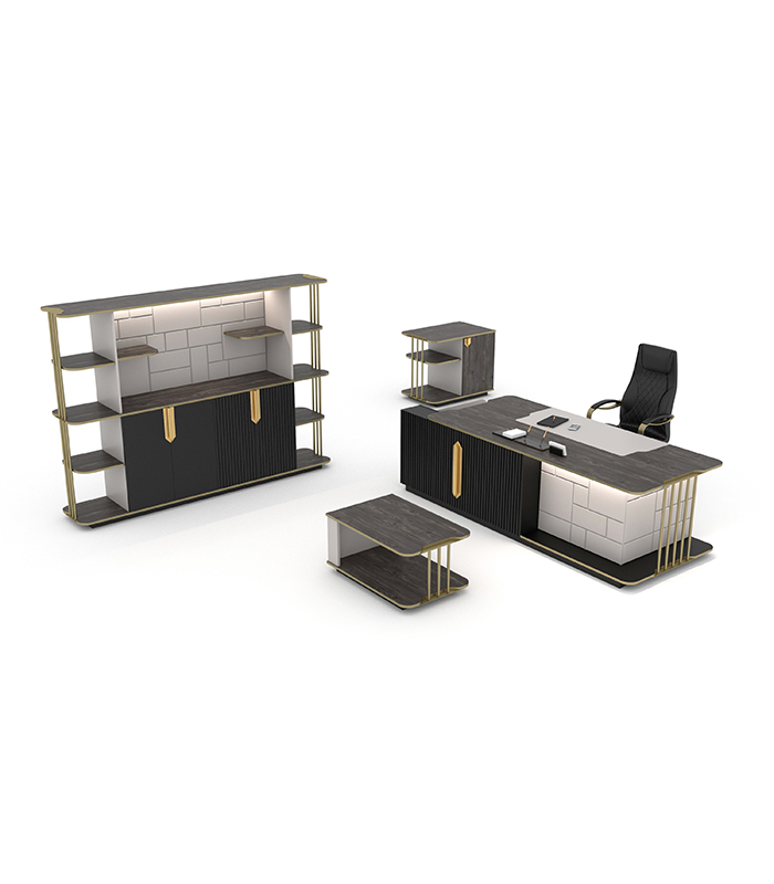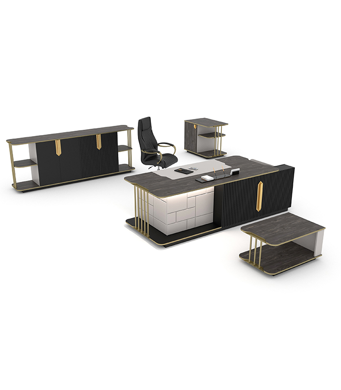 Empire Yönetici Takımı, gold ve pirinç detayları, LED aydınlatmaları ve fonksiyonel çekmece kilidi ile estetiği ve güvenliği bir araya getiriyor. Ofisinize hem şık hem de modern bir hava katarken, dayanıklı yapısıyla uzun süre kullanım imkanı sunuyor.