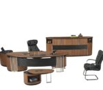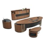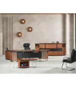 Luca Makam Takımı, doğal ahşap kaplaması ve modern detaylarıyla ofislerinize zarafet katıyor. Siyah lake boyalı kısımları ve mermer desenli yüzeyleri ise takıma şıklık kazandırıyor. Elips formda tasarlanan masa, dolap ve sehpa zarif bir görüntü sunarken, kullanılan krom detaylar da sofistike bir atmosfer yaratıyor. Yatay CNC kanallı masa ön perdesi ve dolap kapakları ise tasarıma hareket kazandırarak sıradanlıktan uzaklaşıyor. Bu takım, ofisinde prestij arayanlar için ideal bir çözüm sunuyor. Koltuklar takımda dahil değildir.